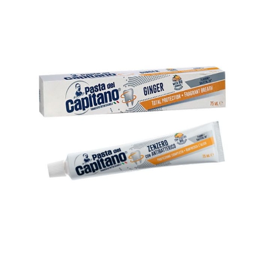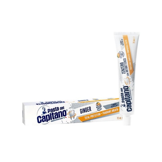 خمیردندان زنجبیل پاستا دل کاپیتانو حاوی عصاره زنجبیل ارگانیک است که به افزایش گردش خون مویرگی کمک میکند و در کاهش بیماری های دهان و دندان تاثیرگذار است. اثرات آنتی باکتریالی این خمیردندان به پاکسازی عمیق حفره دهان کمک میکند و سبب خوشبو نمودن دهان به مدت طولانی میشود. بافت کرمی و سفید رنگ این خمیردندان آن را به گزینه ای مناسب جهت استفاده افرادی که درمان های زیبایی نظیر کامپوزیت و لمینیت ، روکش های دندانی ، ­بلیچینگ و جرم گیری انجام داده اند تبدیل میکند.